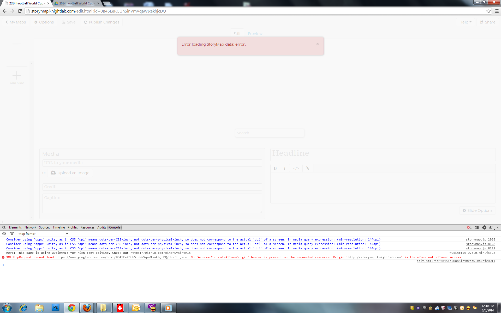 I’m Bikash Singh from Yahoo India. We had created a world cup related story map two days ago. We published the content through our website to many positive reviews. The map, however, has vanished and the link blanked out. I can’t even retrieve it from the edit page inside of Story Map JS. Could you please help me out. Please see the error document in the attachment.